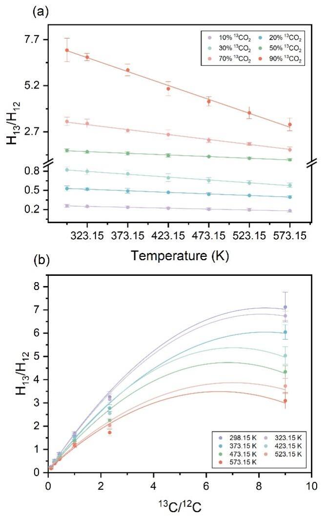 图2 溶解态13CO2和12CO2的峰高比和含量比、温度的关系