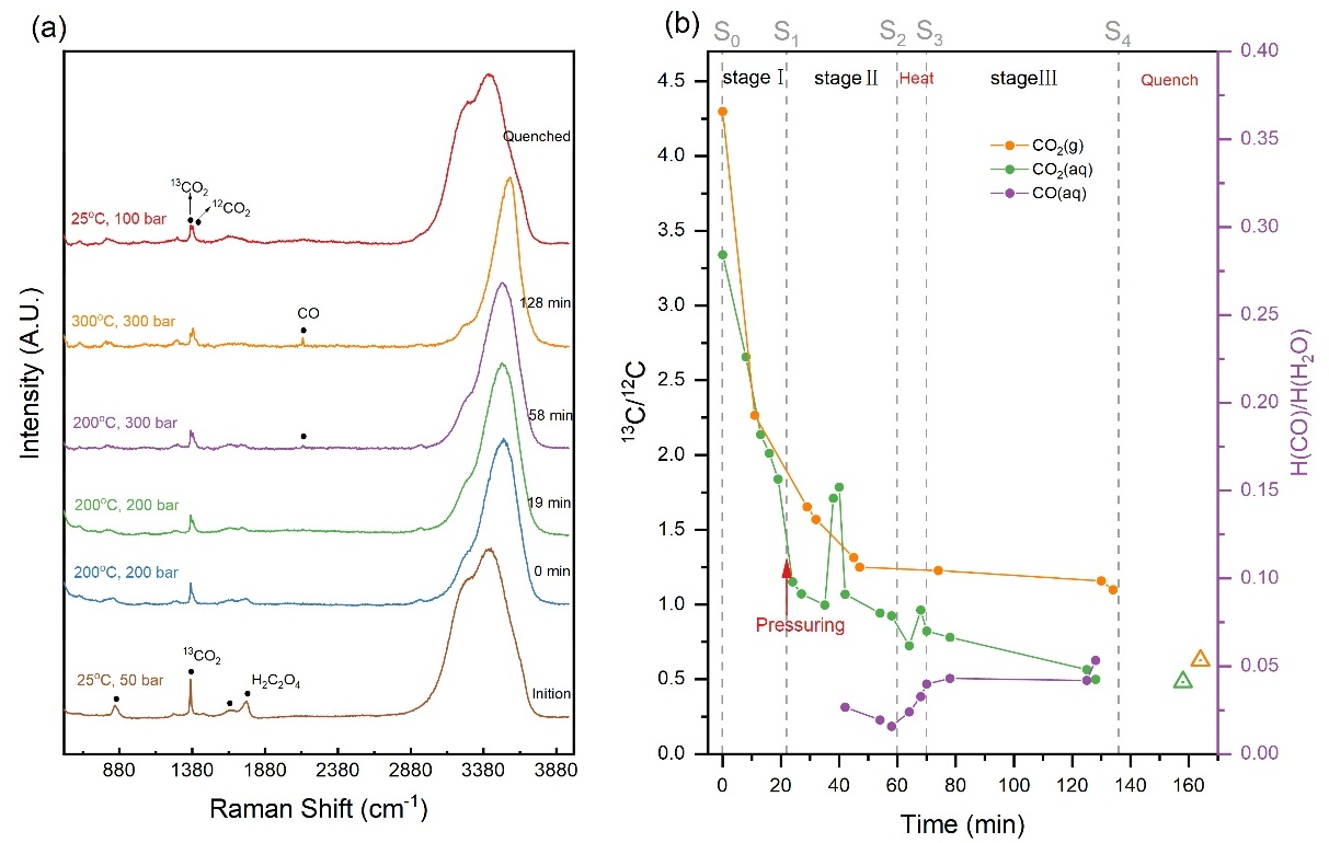 本研究建立的拉曼分析方法结合之前建立的气态/超临界态CO2碳同位素拉曼定量方法[2],能有效实现对于多相复杂体系下碳同位素标记的高温高压水热实验的原位监测。模拟实验表明,热液流体的相分离过程几乎不会导致溶解二氧化碳的碳同位素组成发生变化。然而,沉积有机质(如草酸)的混染会导致热液流体中二氧化碳的含量更高以及 δ13C 值负漂(图3)。