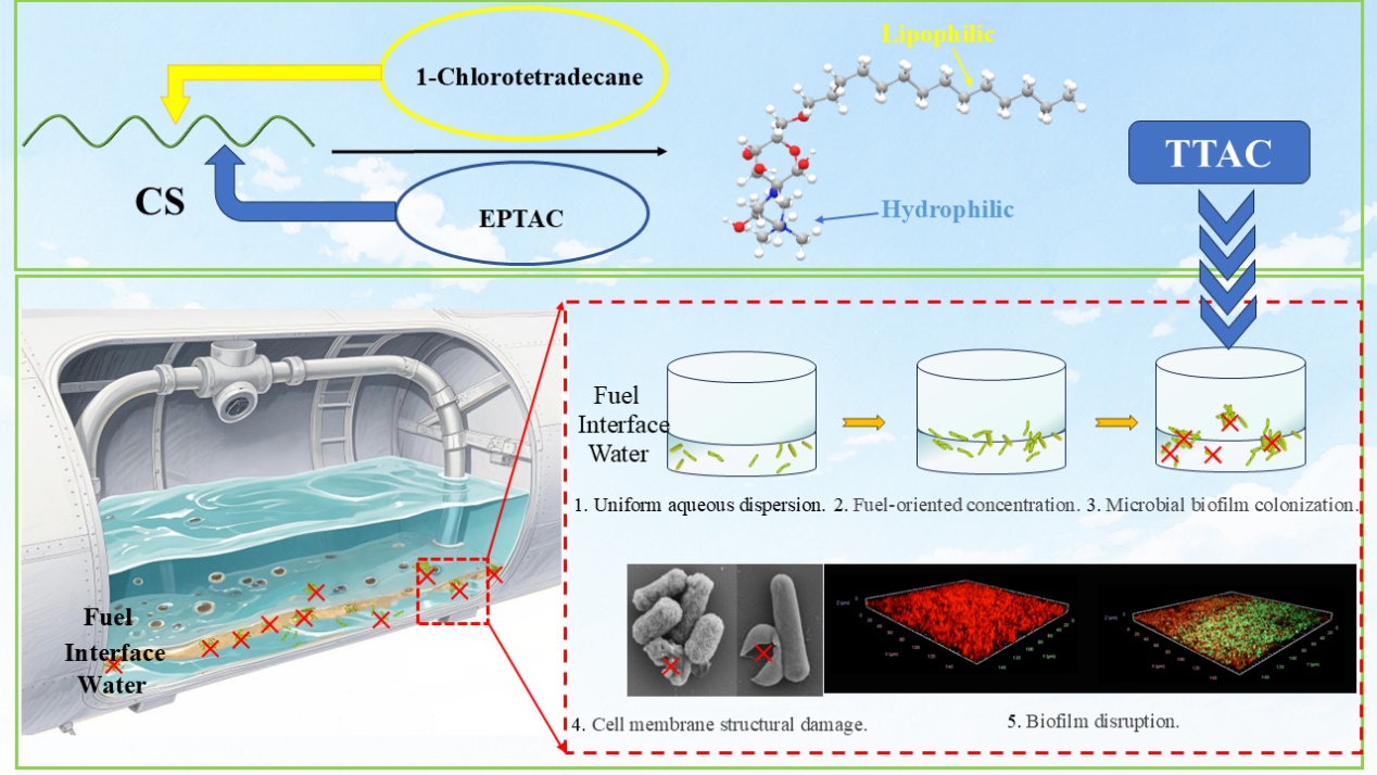 燃油系统中的微生物污染是航空安全的重要隐患之一。微生物污染导致燃油降解及管道、过滤器堵塞等问题,严重影响飞行安全。因此,开发高效、安全的燃油抗菌剂是当前航空领域亟须解决的难题。针对这一问题,研究团队通过化学改性、定向衍生,成功合成了HACCBIT和TTAC,并对其抗菌性能、生物相容性和对金属材料缓蚀作用,进行了系统研究。研究发现,HACCBIT在水中的溶解度是传统抗菌剂BIT的30倍以上,且对人表皮细胞无毒。在抗菌性能方面,HACCBIT对多种航空燃油系统分离的微生物表现出显著的杀菌效果,对7050铝合金缓蚀性提高81.58%。此外,深入研究发现,污染中期生物膜富集于油水界面,通过定向设计生物相容性高的双亲性壳聚糖衍生物抗菌剂,可有效剥离油水界面生物膜,减少金属材料微生物侵蚀作用,提高金属力学性能。