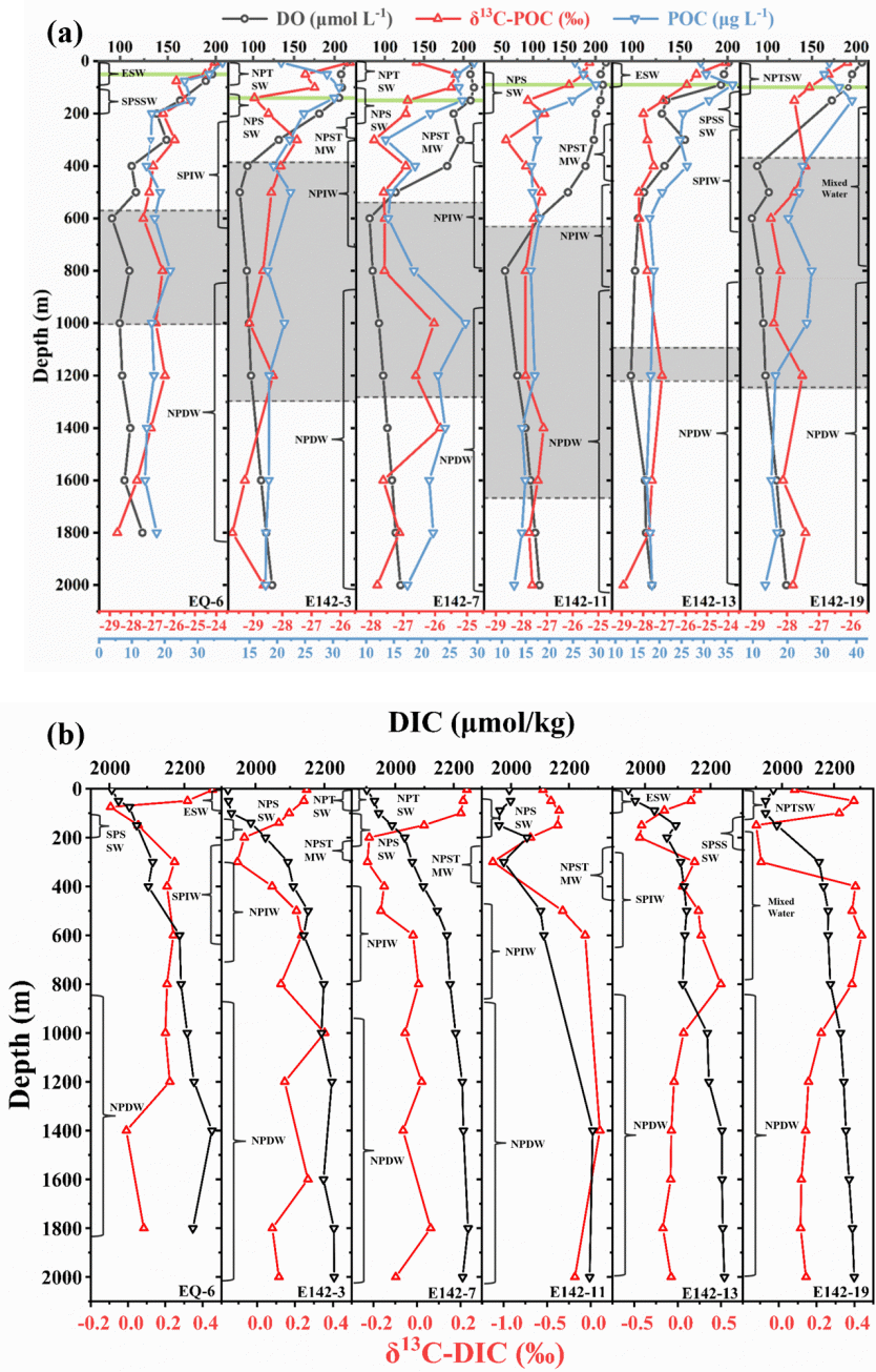 图2?热带西北太平洋地区(a)POC与δ13C-POC、(b)DIC与δ13C-DIC的垂直分布特征