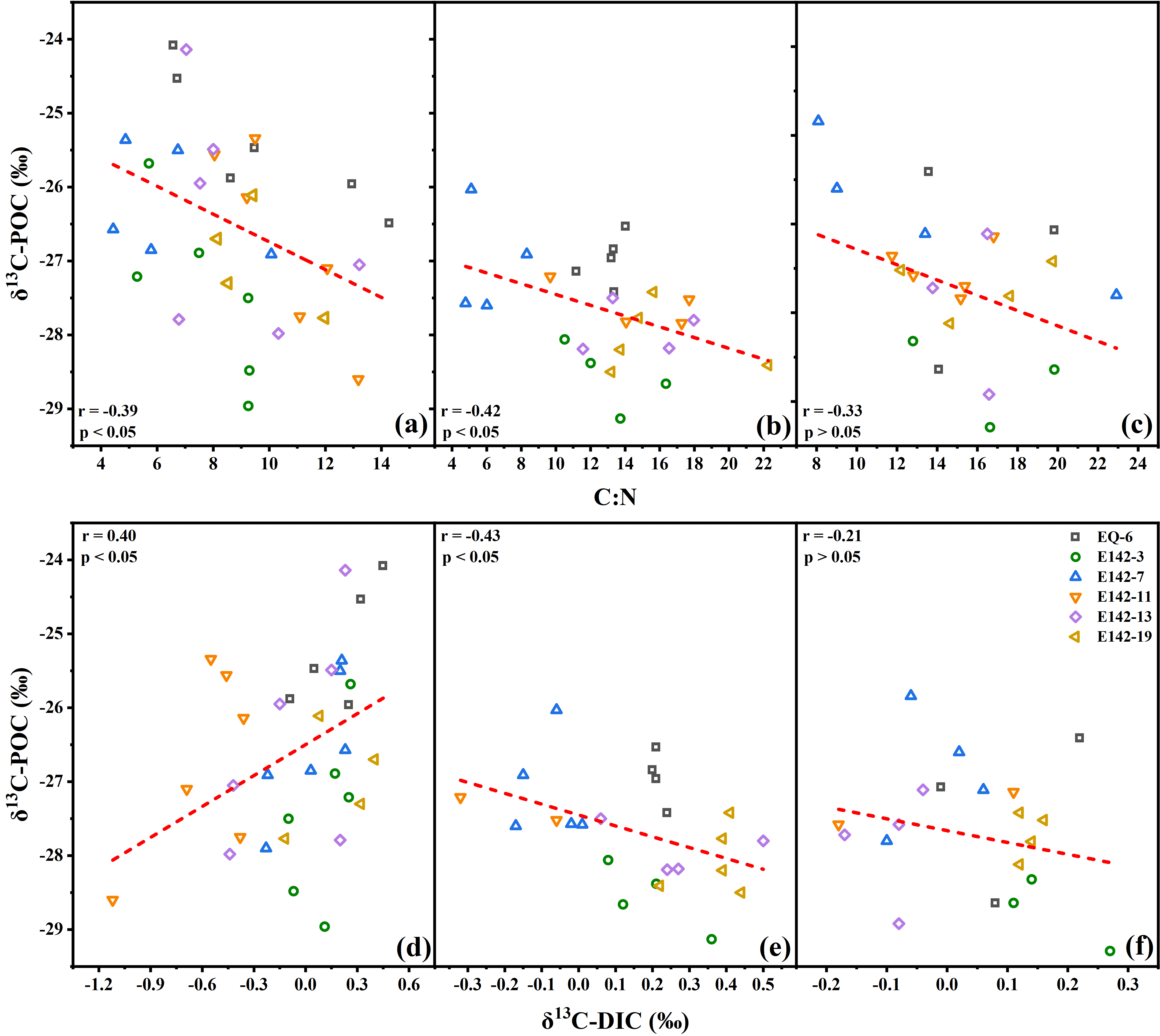 在快速合成-降解层中,δ13C-POC与C:N呈显著负相关,但与POC浓度无显著关系,表明其变化受控于选择性降解和光合作用的共同影响。在净降解层,光合作用基本停止,POC降解占据绝对主导。此时POC中δ13C较重的易降解组分(如氨基酸和糖类)的大量选择性降解导致δ13C-POC值随深度增加逐渐降低。在稳定层,POC浓度较低且主要由难降解的脂质组成,在低温、高压等环境限制下,POC降解速率显著减缓,其向DIC的转化极为有限。因此,尽管该层的POC浓度较低,但其长期稳定埋藏对深海碳汇的贡献不容忽视。