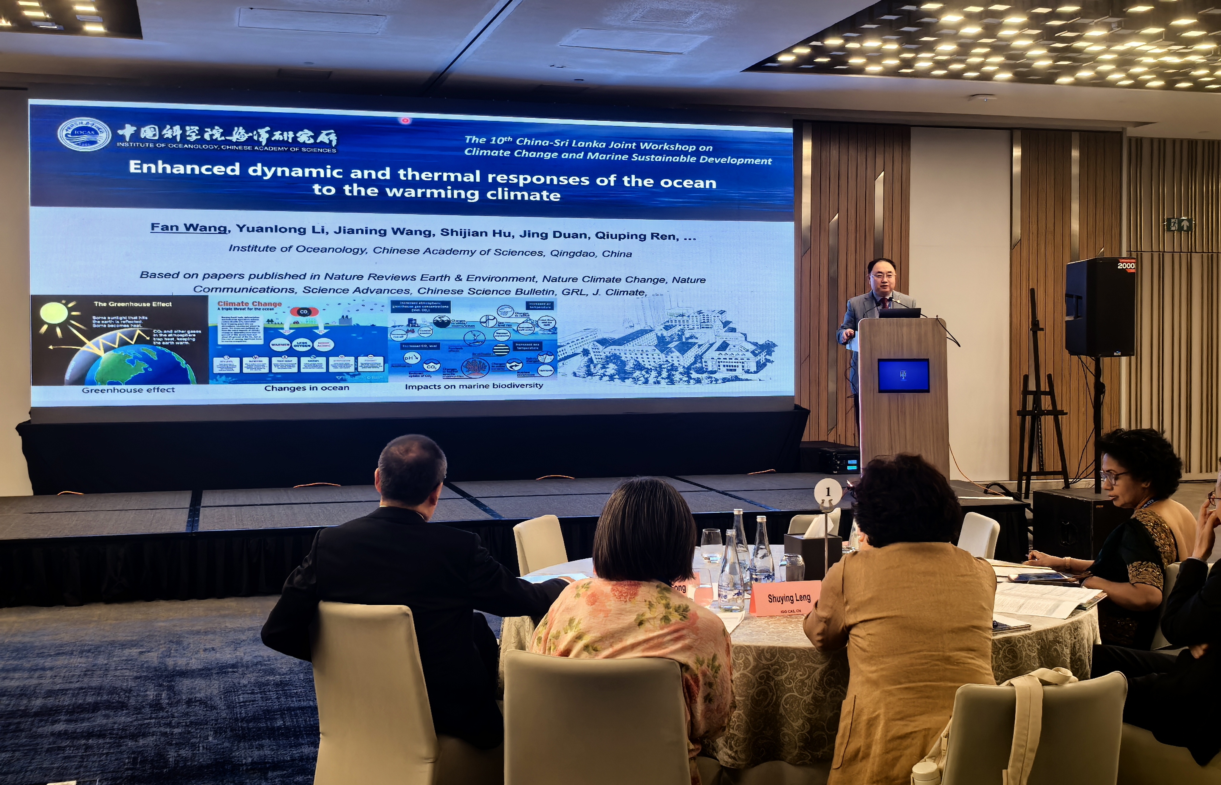 海洋所所长王凡做了题为“Enhanced Dynamic and Thermal Responses of the Ocean to the Warming”的大会主旨报告。报告主要介绍了海洋所在海洋对气候变暖响应规律和机理方面最新成果,论述了气候变化信号进入深部的快速通道机制,报告引起了各国学者的广泛兴趣。王秀通研究员就绿色海洋防腐蚀技术对海洋可持续发展的贡献,以及在斯里兰卡海洋材料腐蚀试验站建设等工作做了介绍。李元龙、周慧、王铮等研究人员向与会各方系统展示了我所近年来在印度洋及印太交汇区海洋观测、动力过程与气候效应等研究领域取得的成果,并围绕气候变化、海洋生态?;び肟沙中⒄沟纫樘庥氲交嶙已д哒箍钊胙刑钟虢涣鳌;嵘虾Q笏狗窒砹艘殉晒衽瞎炭莆淖橹翱蒲辍笔着士蒲Ъ苹癆I赋能智慧观测应对气候变暖威胁(MOSAIC)”,并诚邀中斯中心及与会各国科研机构的科学家加盟MOSAIC计划,携手共建海洋观测网络,为提升全球气候应对能力贡献智慧与力量。